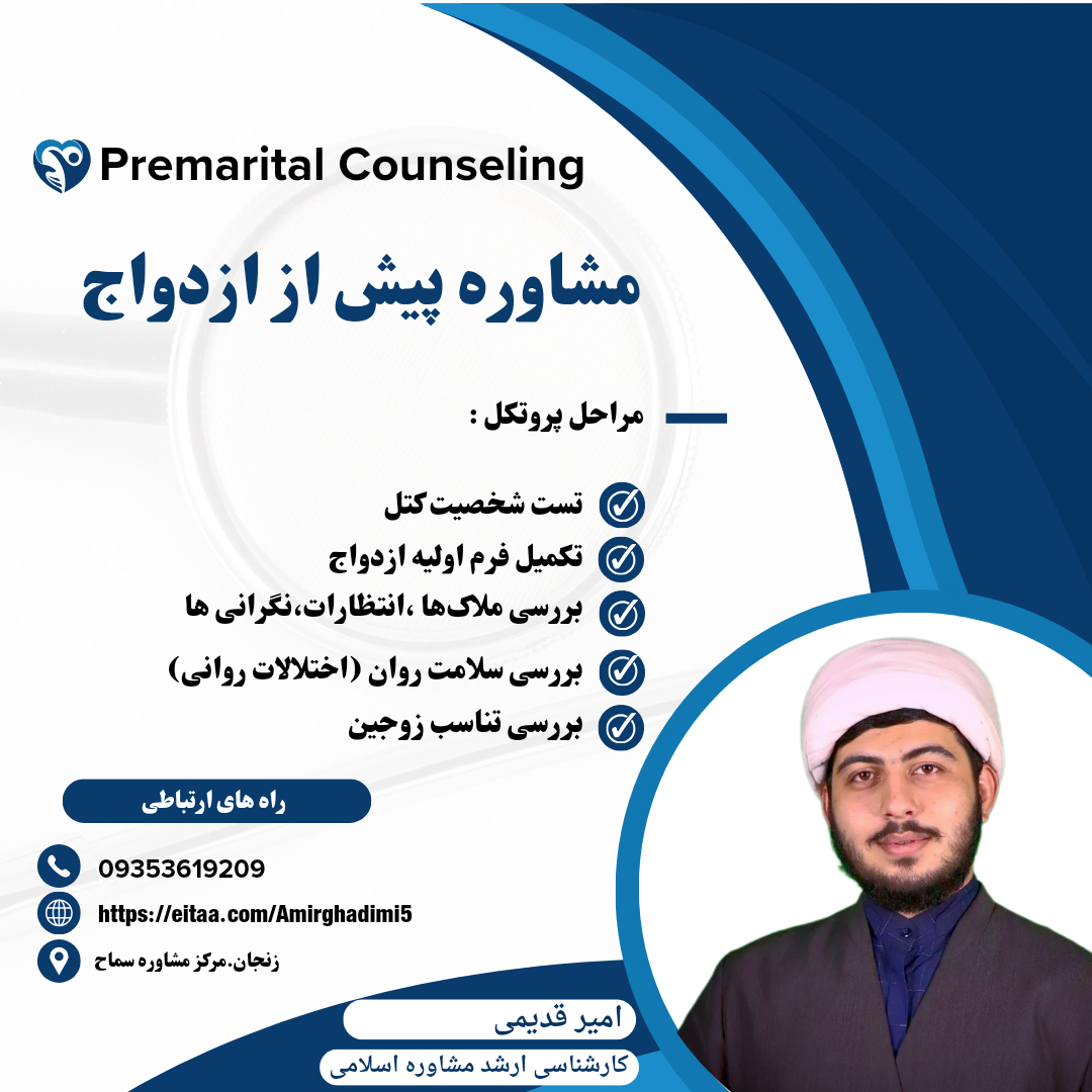 امیر قدیمی یکی از بهترین مشاورها در زنجان هستند که در زمینه ازدواج وخانواده و … مراجعه کننده می پذیرد. کلینیک امیر قدیمی در سبزه میدان خیابان شهید حبیبی می باشد. برای کسب اطلاعات بیشتر می توانید با شماره 09199781416 تماس حاصل نمایید. همچنین در صورت نیاز به آدرس صفحه اینستاگرام Amirghdimi _ir و کانال تلگرام ایشان و وب سایت اینترنتی دکتر هم میتوانید در پروفایل دکتر مشاهده نمایید. عکس و بیوگرافی امیر قدیمی و همچنین تصاویر نمونه کار ایشان در ادامه قابل مشاهده است.